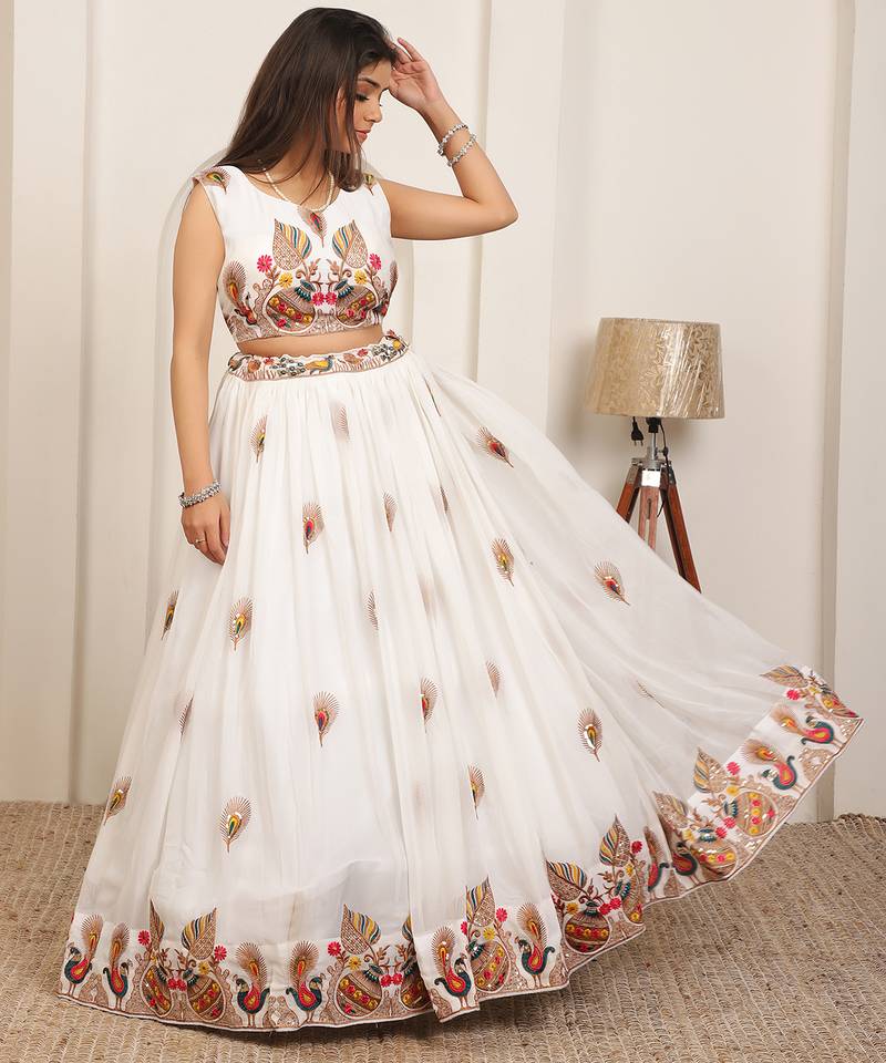 Elegant Design: Stunning White Lehenga Choli Set Featuring Intricate Peacock And Deer Motifs With Traditional Embroidery Work, Perfect For Festive Occasions And Celebrations.