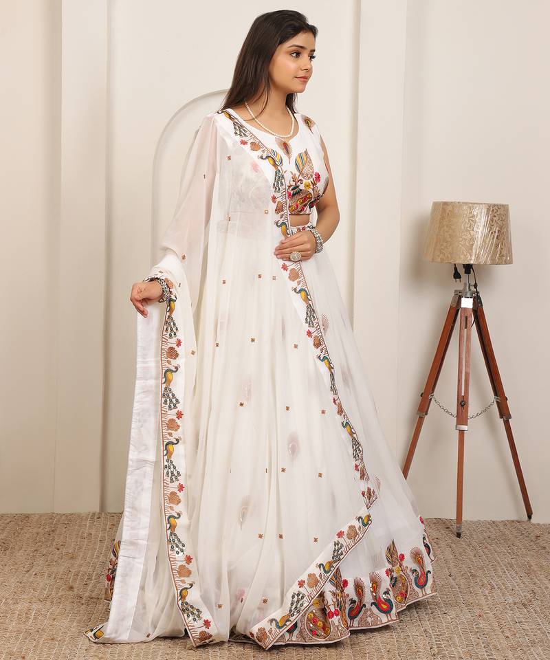 Product Name White Embroidery Work Georgette Fabric Party Wear Lehenga Choli With Dupatta.