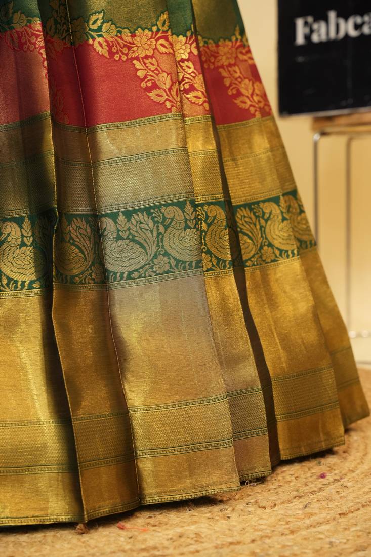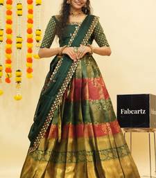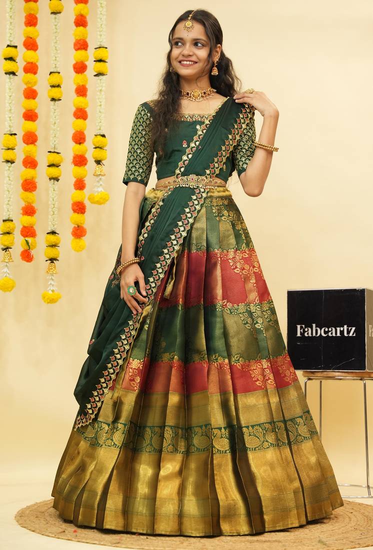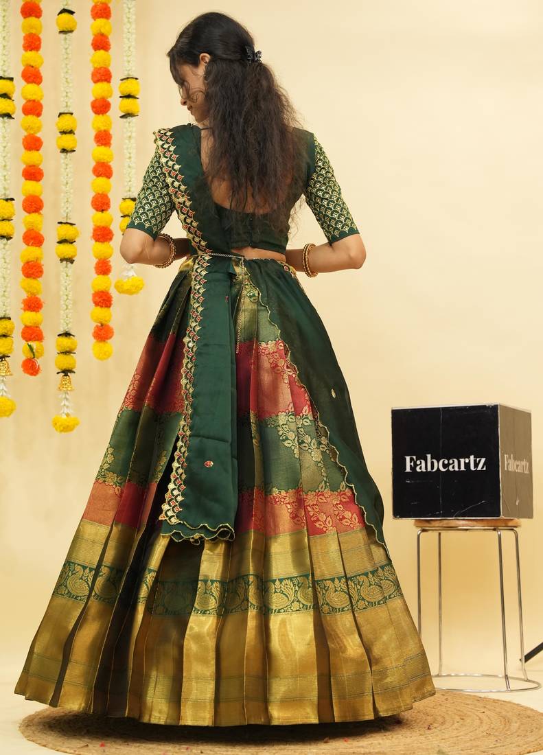 Beautiful south indian style semi-stitched half saree with embroidered blouse and rangoli dupatta for women