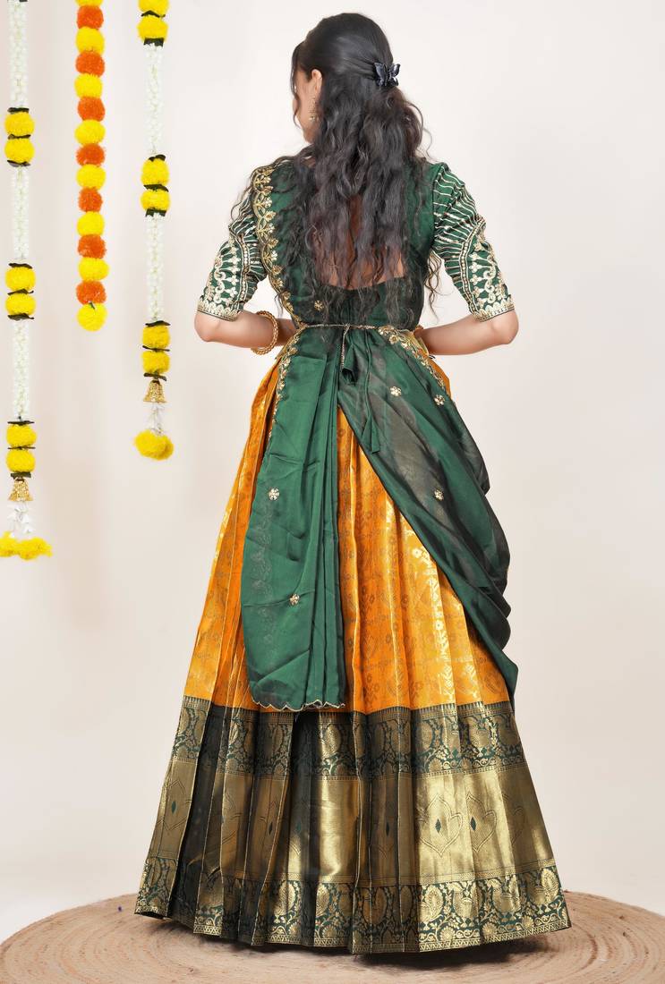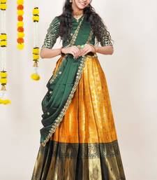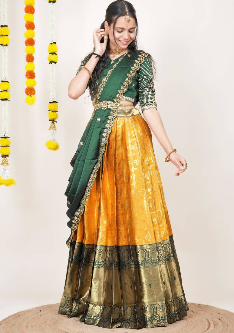 Beautiful south indian style semi-stitched half saree with embroidered blouse and rangoli dupatta for women