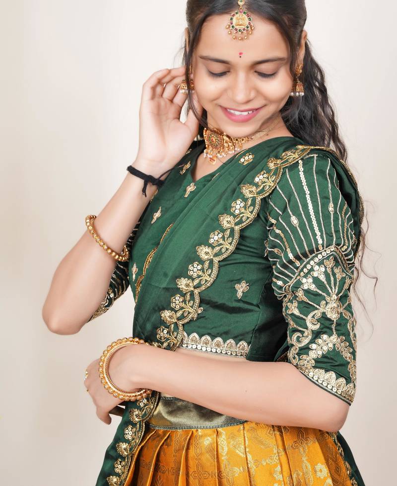 | Product Name | Beautiful South Indian Style Semi Stitched Half Saree With Embroidered Blouse And Rangoli Dupatta For Women | |