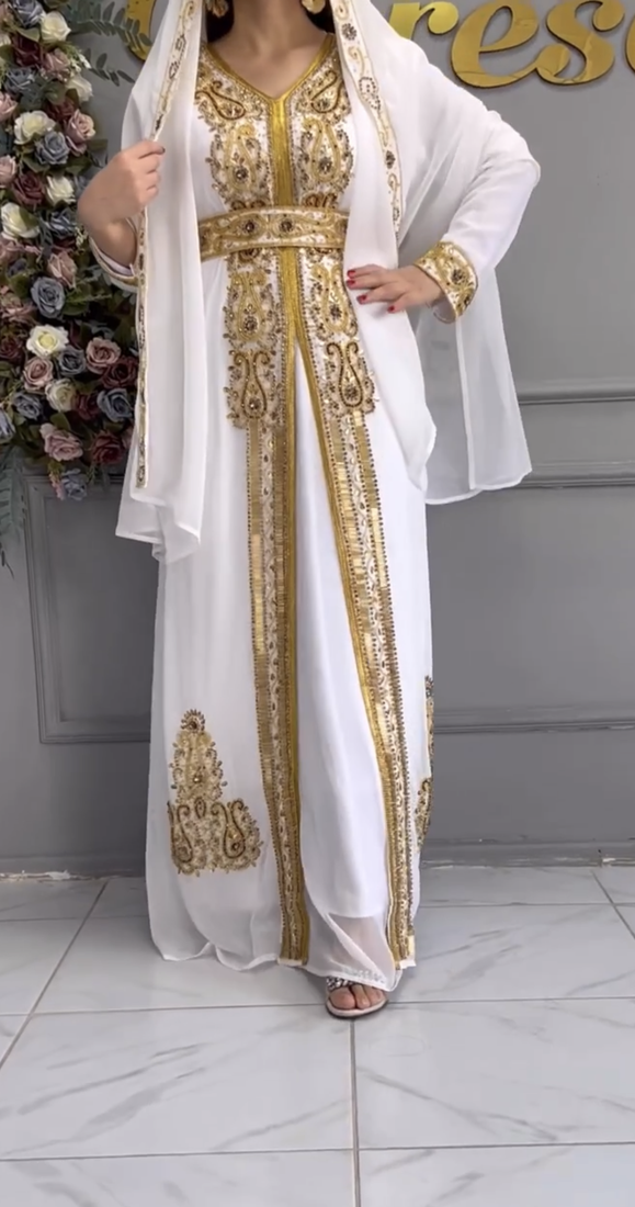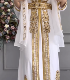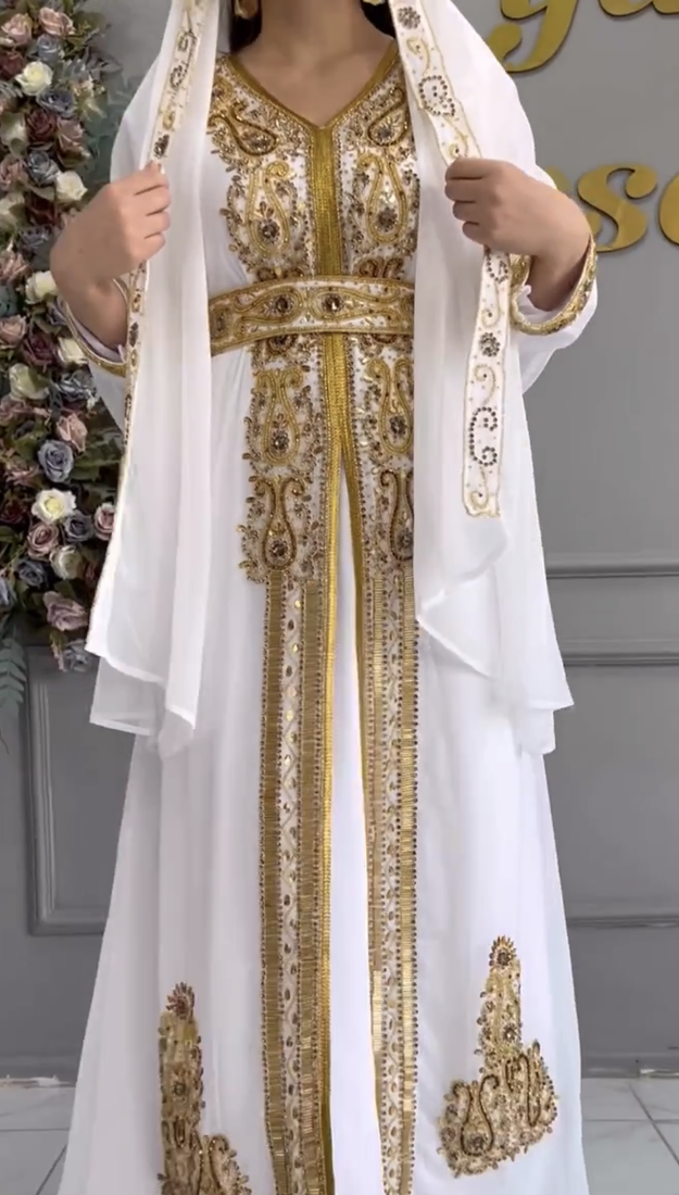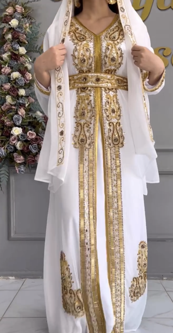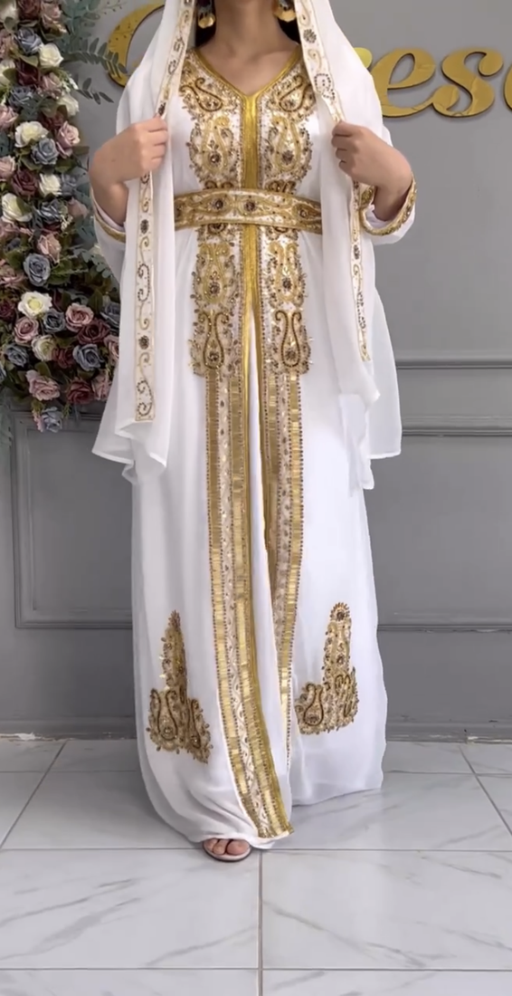The Kaftan Comes With A Stylish Cape Layer That Adds A Modern And Graceful Touch To The Overall Design. The Cape Is Decorated With Matching Embroidery, Making The Entire Outfit Look Coordinated And Classy. The Embroidered Belt Allows You To Adjust The Fitting Easily And Gives A Well Shaped Look To All Body Types. This Beautiful White And Gold Combination Is Ideal For Weddings, Nikah Ceremonies, Festive Functions, Engagement Parties, And Evening Occasions. The Color Adds A Soft, Pure, And Elegant Vibe, While The Intricate Handwork Ensures You Stand Out In The Crowd. Pair This Kaftan With Gold Accessories And Heels For A Perfect Royal Look. |