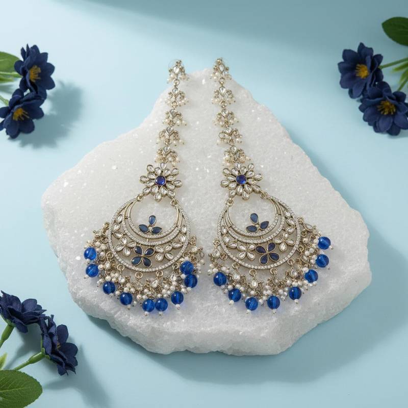 Chain Length: 8.50 Cm | Earring Length: 10.50 Cm X Width: 5.50 Cm | Metal: Alloy With Good Quality Mehendi Gold Plated | Color: Blue | Stone: Kundan & Imitation Pearl | Gross Weight: 80.00 Grams | Package Content: 1 Pair Of Earrings | Back Finding: Post With Friction Back X Earring Style: Dangle