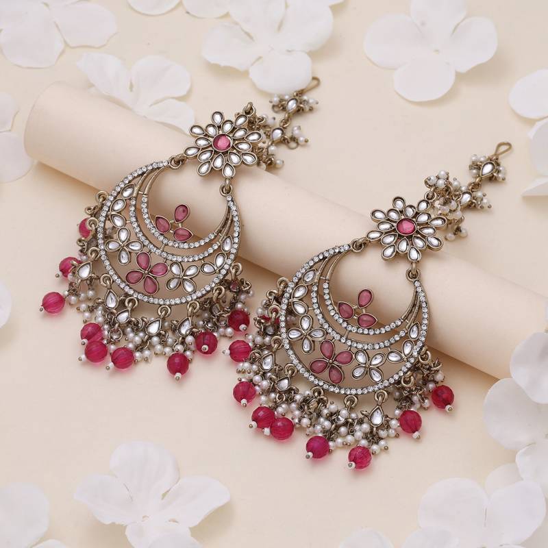 | Product Description | Chain Length: 8.50 Cm | Earring Length: 10.50 Cm X Width: 5.50 Cm | Metal: Alloy With Good Quality Mehendi Gold Plated | Color: Rani | Stone: Kundan & Imitation Pearl | Gross Weight: 80.00 Grams | Package Content: 1 Pair Of Earrings | Back Finding: Post With Friction Back X Earring Style: Dangle |