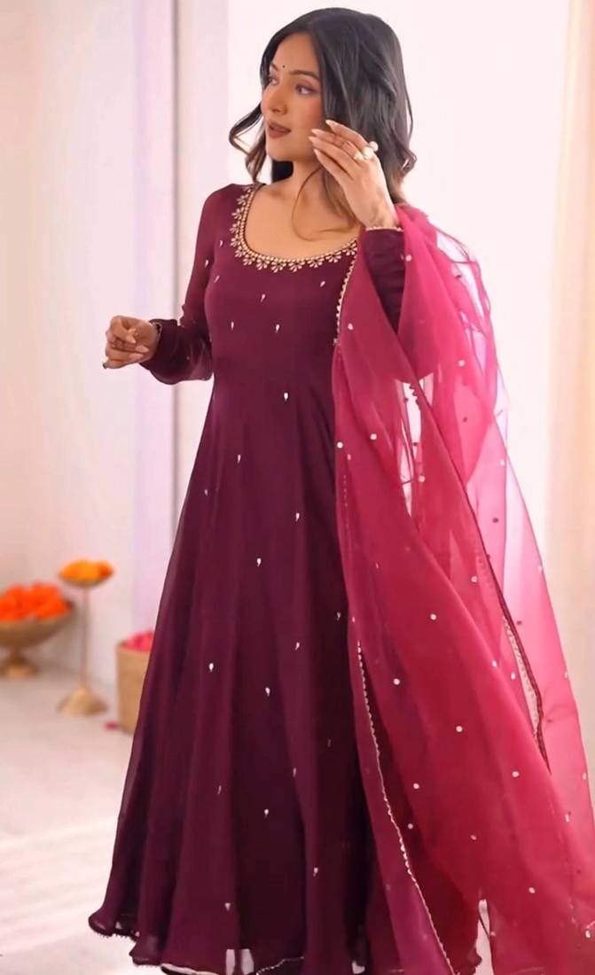 | Product Name | Georgette Embroidery Work Wine Readymade Gown | |