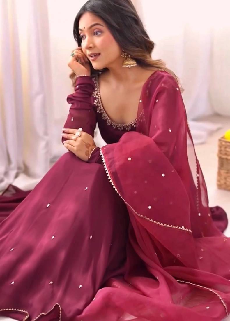 Georgette embroidery work wine readymade gown stitched
