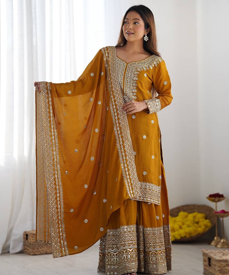 Heavy chinon silk embroidery and sequence work yellow readymade salwar suit stitched