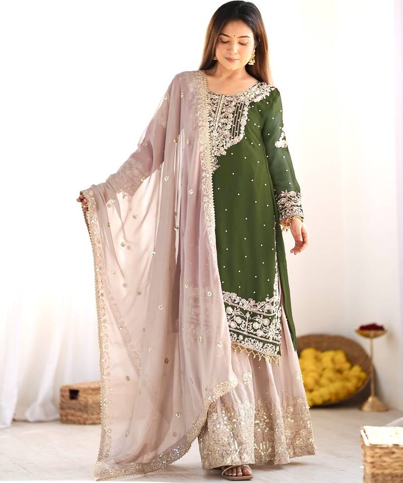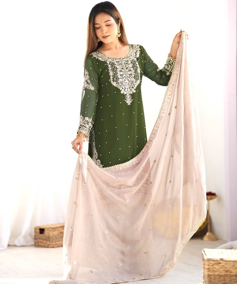 | Product Name | Heavy Fuax Georgette Embroidery And Sequence Work Green Readymade Salwar Suit | |