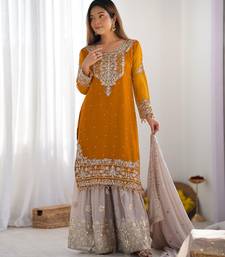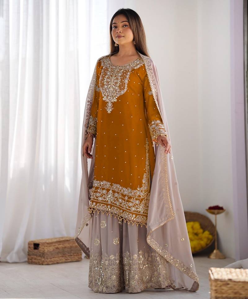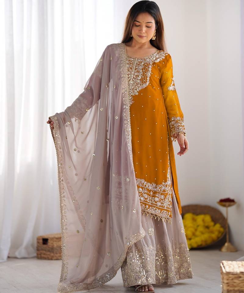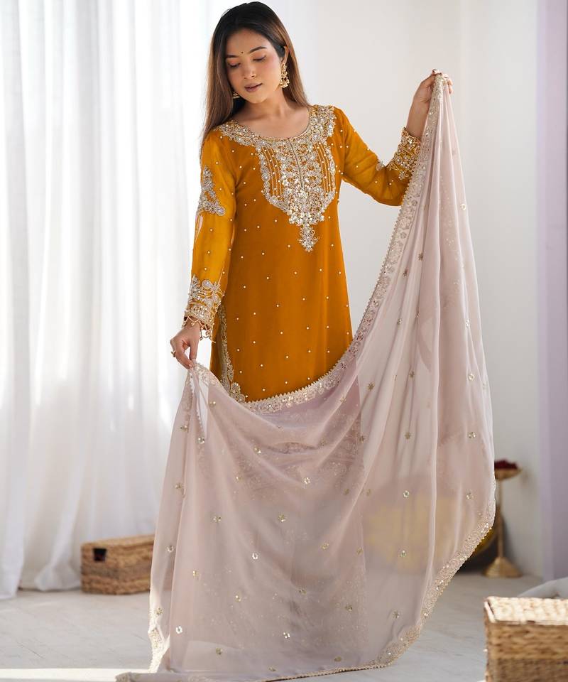 | Product Name | Heavy Fuax Georgette Embroidery And Sequence Work Yellow Readymade Salwar Suit | |