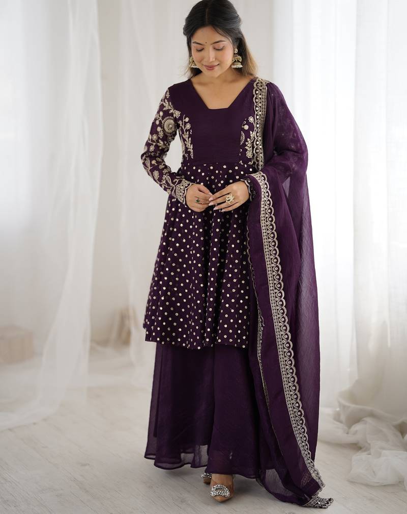 | Product Description | Top Fabric : Pure Silk, Sharara Plazzo : Pure Silk, Work :Embroidery Work, Dupatta Fabric: Silk, Stitch : Full Stitched With Elastic Bottom |