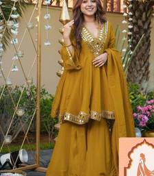 | Product Description | Upgrade Your Festive And Wedding Wardrobe With This Premium 3 Piece Palazzo Set Crafted In Cosmos Fabric. The Outfit Is Designed In A Stunning Mustard Shade, Giving It A Royal And Elegant Appeal. The Top Features Real Mirror Work With Intricate Embroidery, Creating A Rich Designer Look Perfect For Functions, Parties, And Special Occasions. |