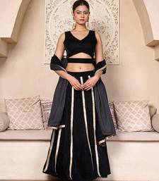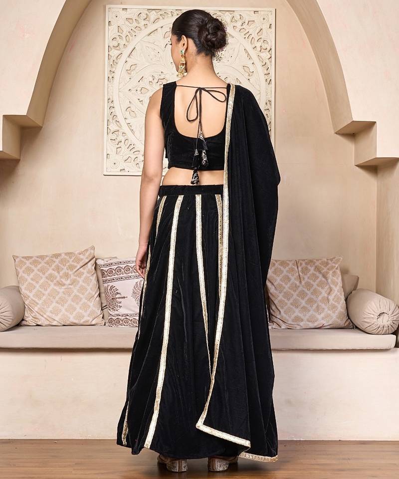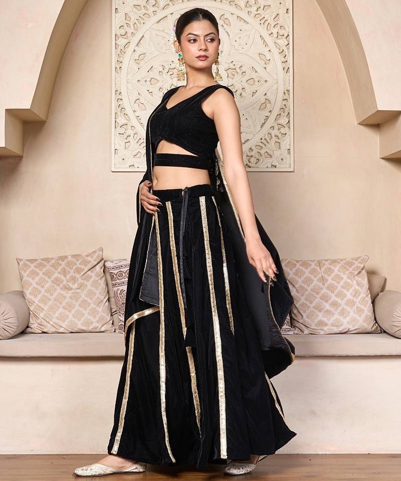| Product Description | Black Velvet Lehenga Choli Set Designed With Stylish Tiered Layers And Metallic Gota Lacing That Gives The Outfit A Bold And Refined Look. The Velvet Blouse Features A Clean And Structured Design That Pairs Well With The Flowing Lehenga. Vertical Gota Lace Detailing On The Lehenga Panels Adds Texture And Highlights The Rich Black Color. The Set Includes A Matching Dupatta That Completes The Overall Appearance With Subtle Finishing. Velvet Fabric Gives The Outfit A Luxurious Feel While Maintaining Comfort And Elegance. The Combination Of Black Velvet And Metallic Gota Accents Makes This Lehenga Choli Set A Great Option For Evening Celebrations, Festive Events, And Wedding Functions. |