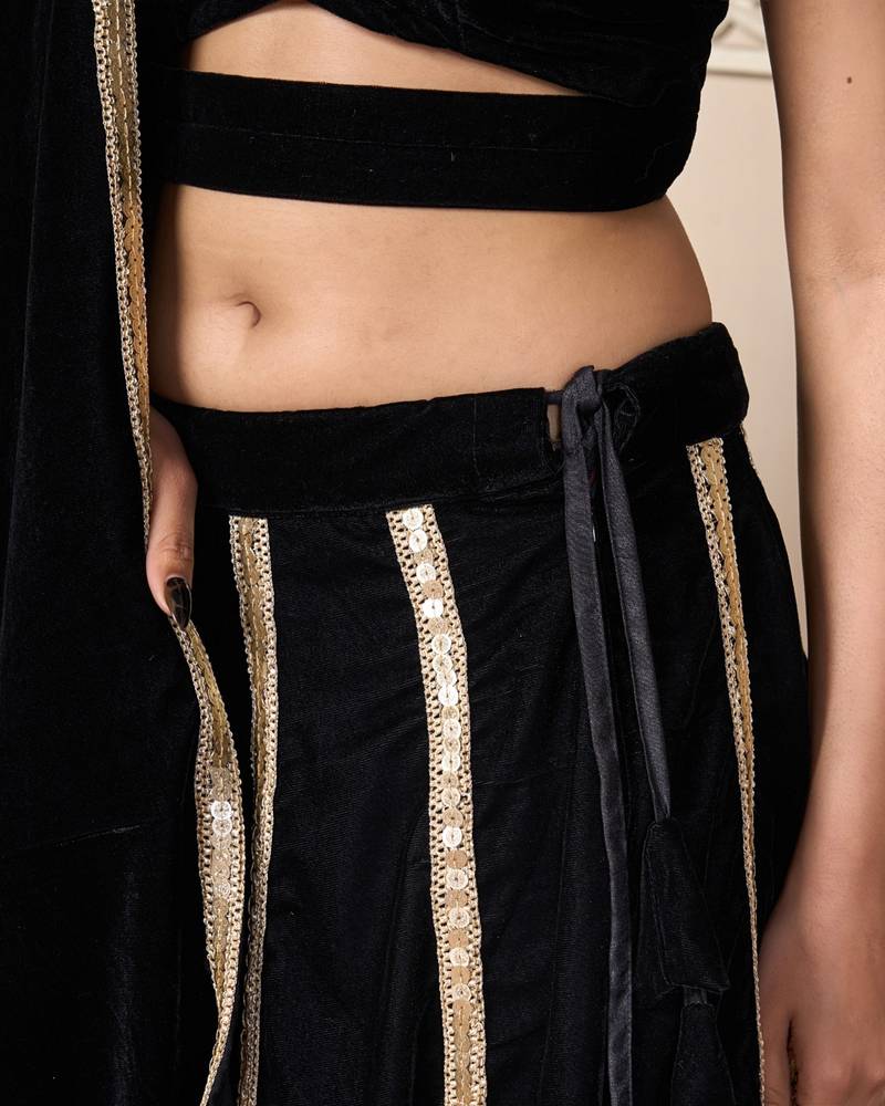 Black velvet designer lehenga set with gota lace detailing