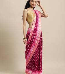 | Product Description | Hand Dyed Maroon And Pink Bandhani Saree In Art Silk Embellished With Golden Zari Border. T Comes With A Matching Unstitched Blouse With Zari Border. |