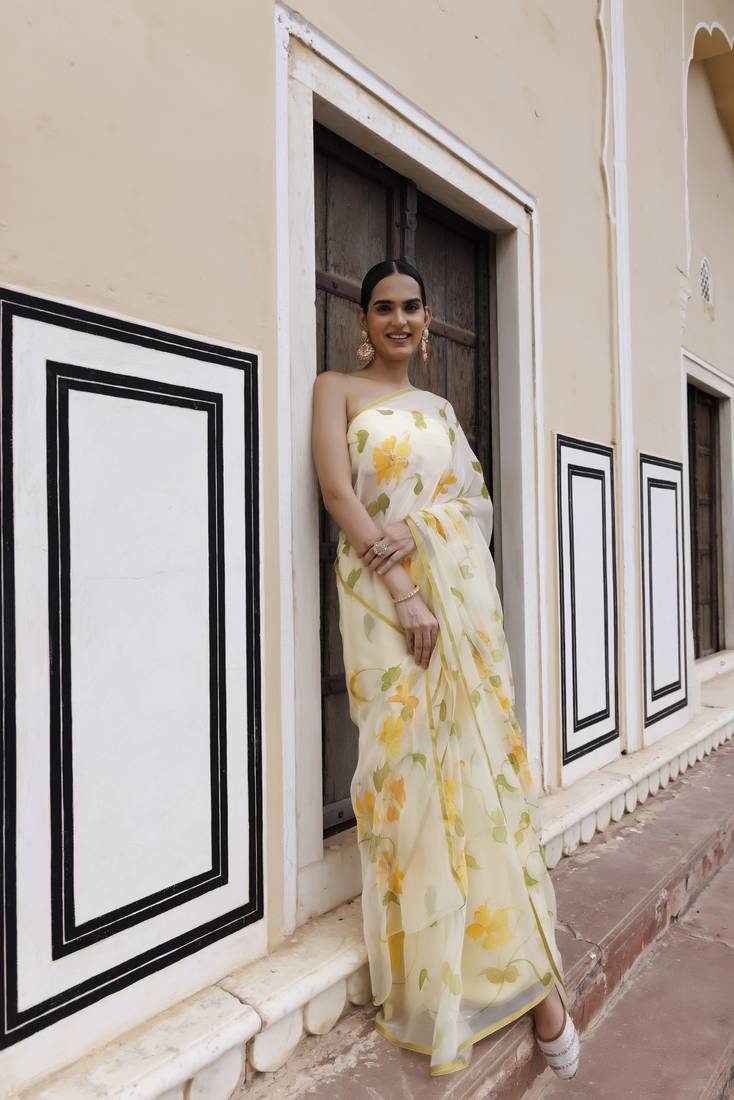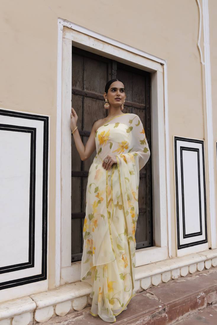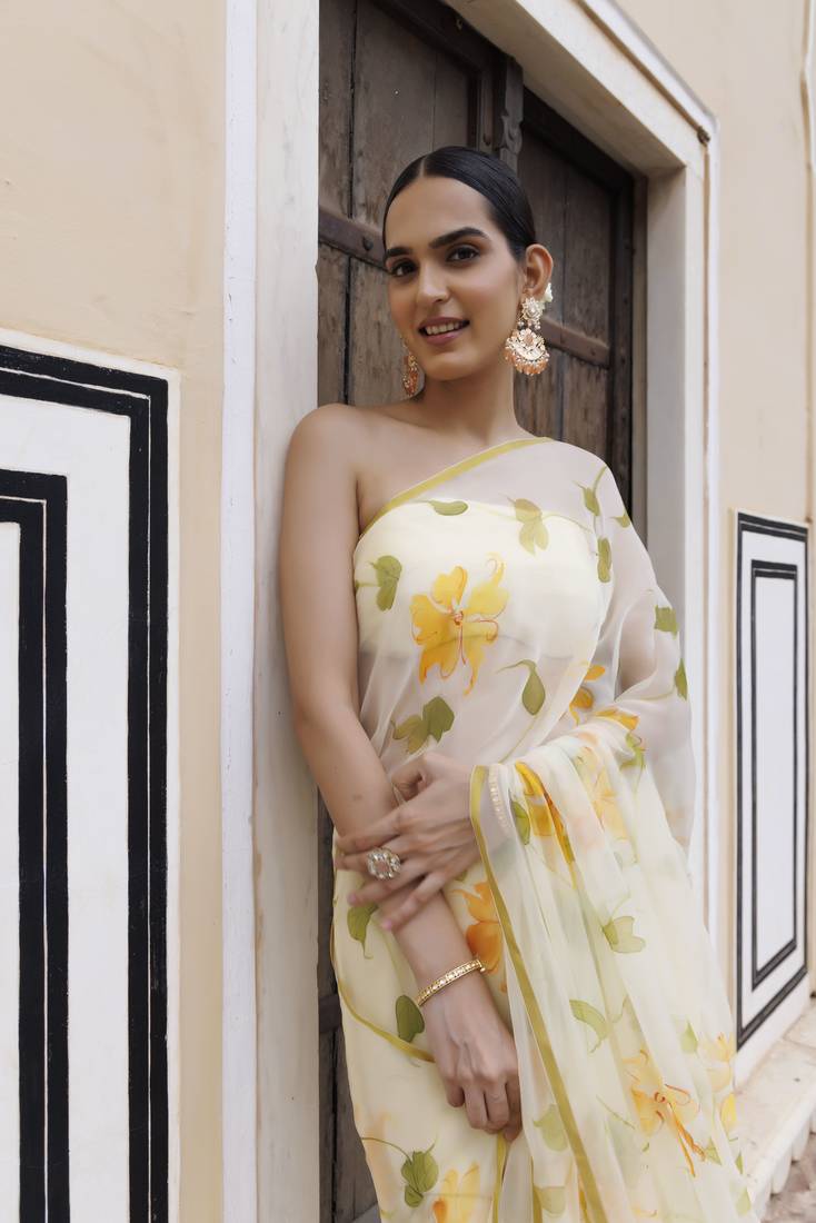 Geroo jaipur yellow hand painted floral chiffon saree with blouse