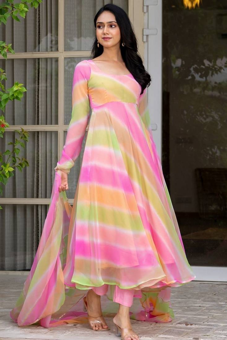 Multi printed chinnon lehriya anarkali and pant and dupatta