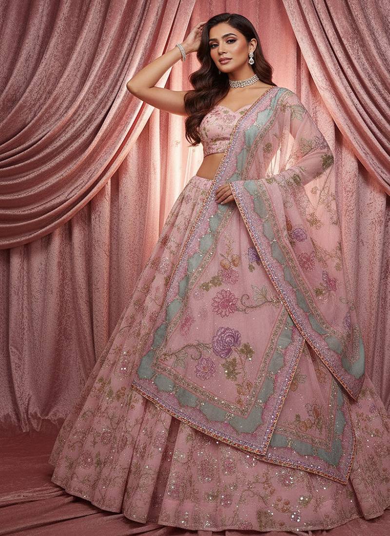 | Product Description | Embrace Ethereal Beauty In This Floral Embroidered Net Lehenga. The Soft Pastel Pink Ensemble Features Delicate Sequin Work And Intricate Vine Motifs Across The Flared Skirt And Sleeveless Blouse. Completed With A Sheer Dupatta Boasting A Contrasting Grey Scalloped Border, This Romantic Outfit Is Perfect For Receptions And Engagement Parties. |
