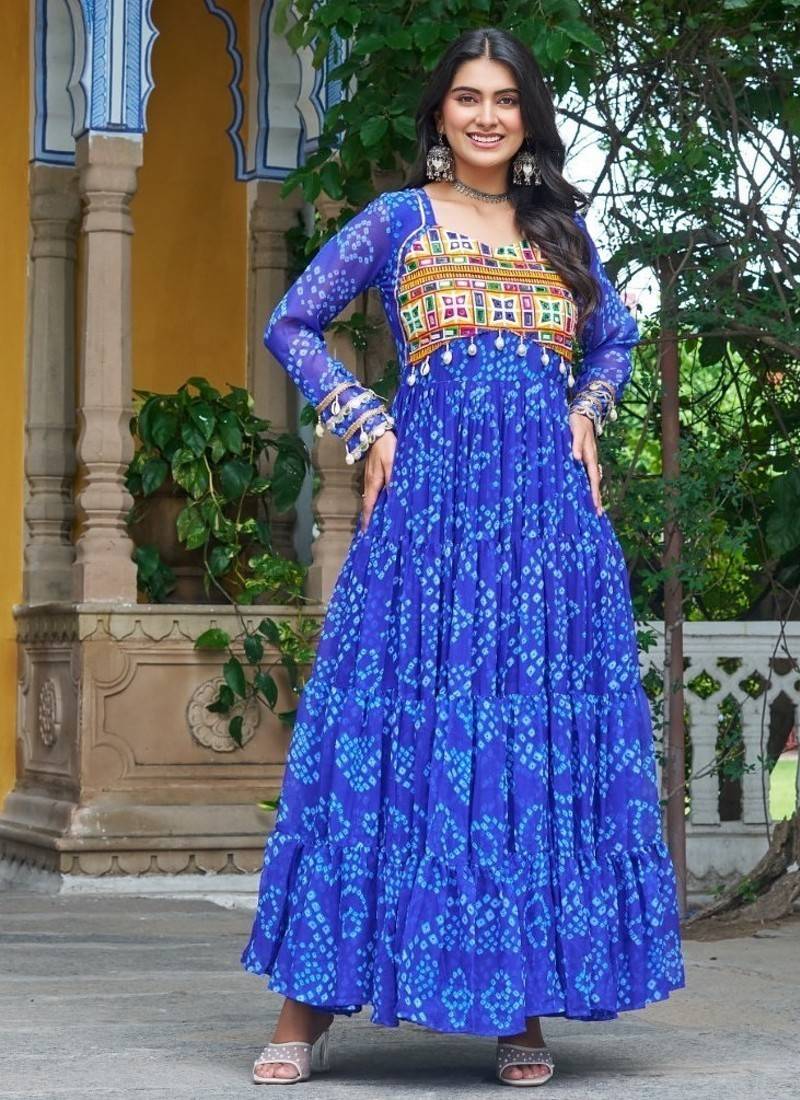| Product Description | Make A Bold Ethnic Statement With This Blue Faux Georgette Kutchi Patchwork Gown, Crafted For Women Who Love Vibrant And Artistic Festival Wear. The Rich Blue Color Enhances The Detailed Kutchi Patchwork, Giving The Gown A Traditional Yet Fashionable Look Perfect For Garba Nights, Navratri Functions, Festive Events, Family Celebrations, And Cultural Gatherings. The Lightweight Faux Georgette Fabric Ensures Comfort And Smooth Flow, While The Semi Stitched Format (Up To Size 42) Allows Easy Customization For A Perfect Fit. Designed To Stand Out Effortlessly, This Gown Blends Colorful Patchwork Artistry With Modern Elegance—Making It A Must Have For Festive Wardrobes. |