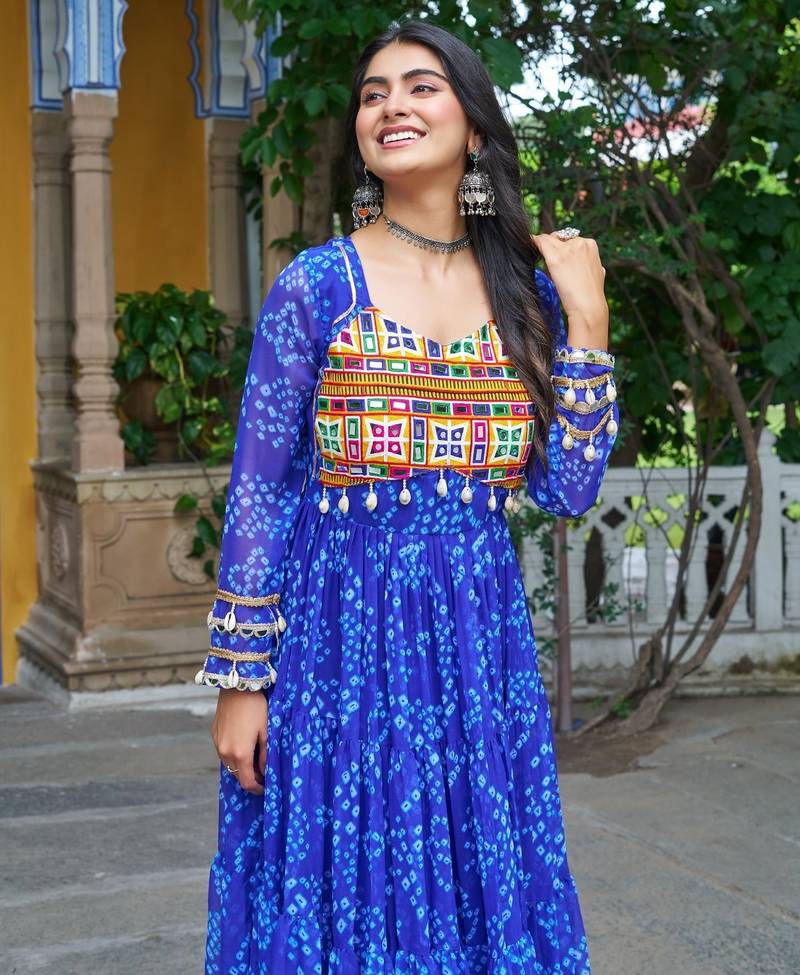 Blue faux georgette kutchi patchwork semi stitched gown for women | traditional festival wear gown