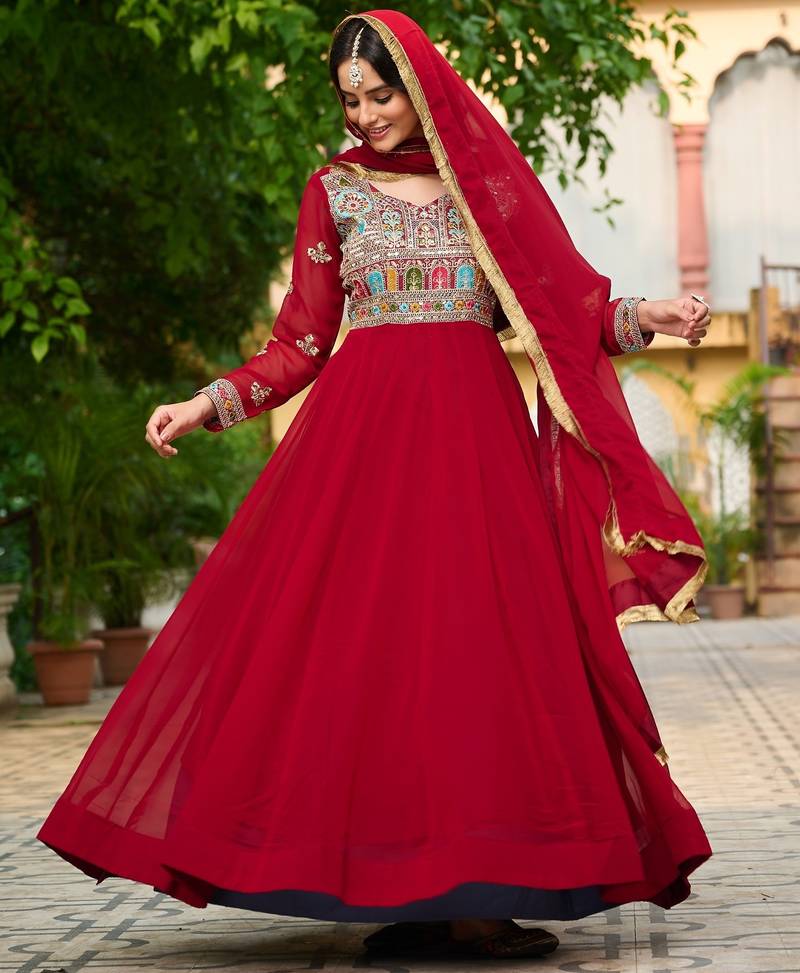 | Product Description | Step Into Timeless Elegance With This Rich Maroon Faux Blooming Embroidered Gown, Crafted For Women Who Love Premium Ethnic Fashion With A Graceful Finish. Made From High Quality Faux Blooming Fabric, The Gown Offers A Smooth Texture, Effortless Flare, And A Luxurious Fall That Enhances Every Movement. The Deep Maroon Shade Adds Sophistication, While The Fine Embroidery Detailing Elevates The Overall Royal Appeal. Paired With A Beautifully Finished Zari Lace Border Dupatta, This Outfit Is Perfect For Festive Occasions, Parties, And Traditional Functions. Fully Stitched And Ready To Wear, It Ensures Stunning Style With Complete Comfort. |