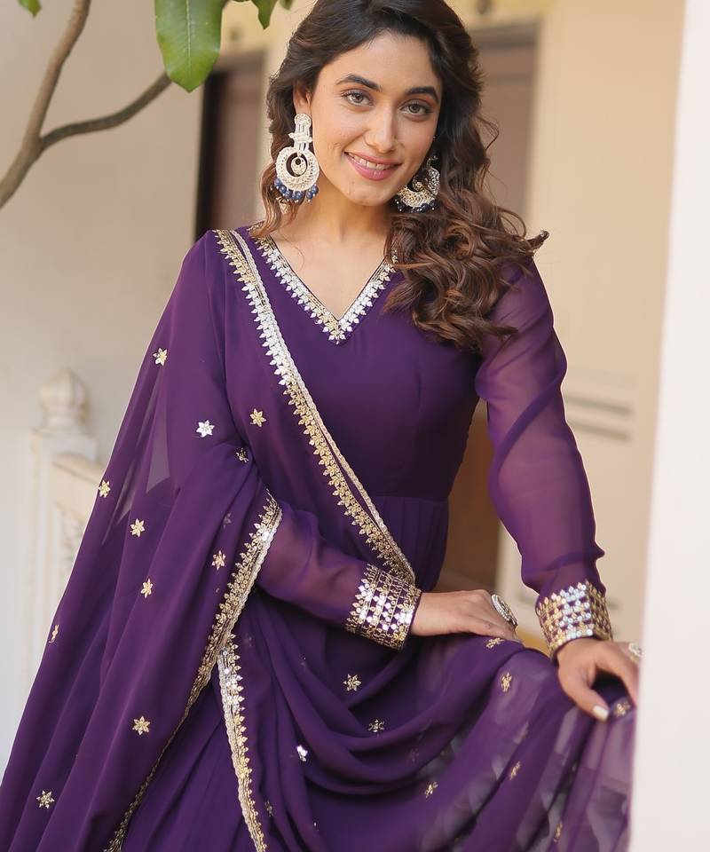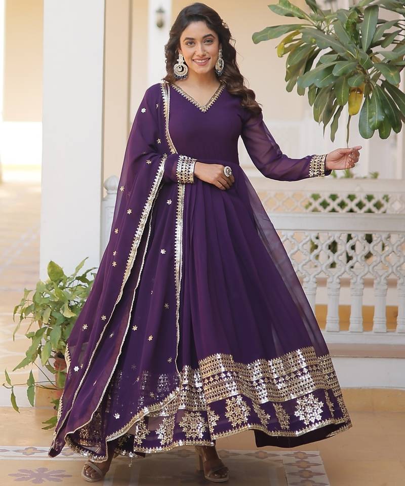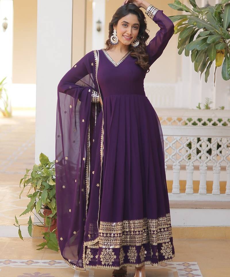 | Product Description | Deep, Rich And Effortlessly Royal—This Wine Gown From The Premium Series Is Crafted To Deliver A Luxurious Festive Presence. Made From High–Quality Faux Blooming Fabric, The Gown Drapes Beautifully With A Smooth Texture And Premium Fall, Offering Both Elegance And Comfort. The Outfit Is Adorned With Heavy Embroidery And Sequins Detailing, Giving A Shimmering Yet Classy Festive Glow. With A Stitched Finish, 56 Inch Length And 2.3 Meter Flair, This Gown Creates A Perfect Silhouette For Grand Celebrations. The Matching Embroidered Dupatta Completes The Look With Refined Sophistication. |