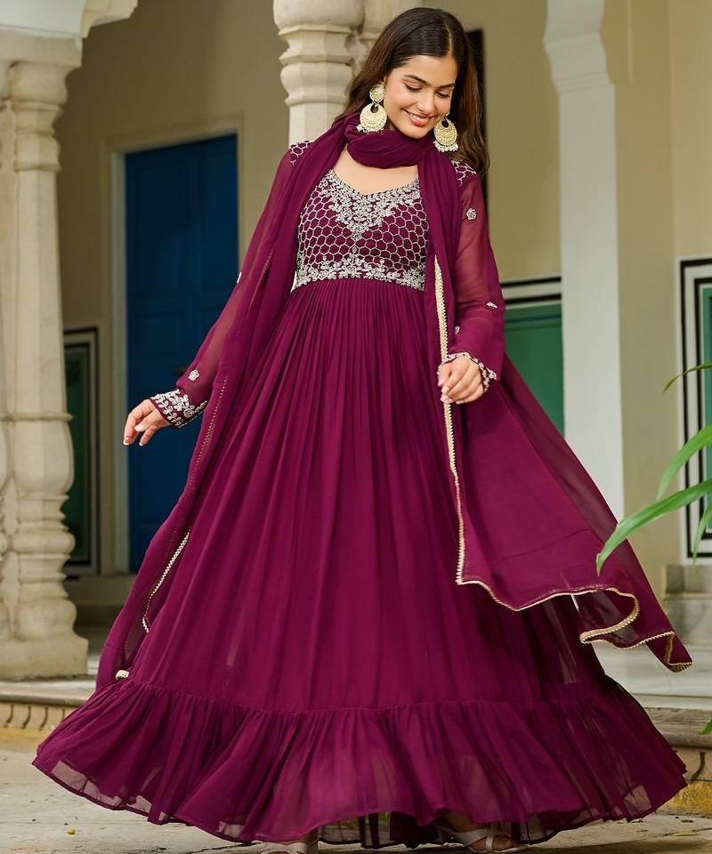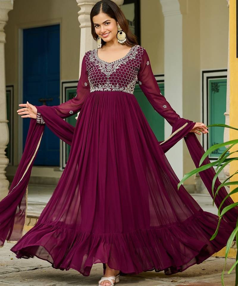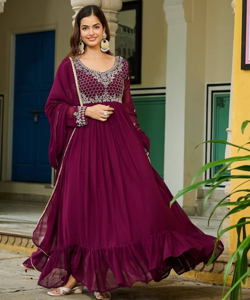 | Product Description | Step Into Timeless Elegance With This Wine Faux Blooming Designer Gown, Crafted To Give You A Rich And Graceful Appearance. The Soft Flowing Fabric Paired With Intricate Lace Border Embroidery Enhances Its Premium Charm. Beautifully Stitched For A Flawless Fit, This Gown Delivers Comfort And Sophistication In Every Detail. Ideal For Weddings, Receptions, Festive Celebrations, Family Events, And Evening Parties—This Outfit Ensures A Royal, Standout Presence. |