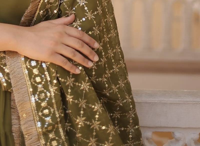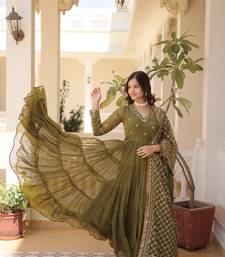 Faux georgette heavy sequins embroidered stitched gown with dupatta mehendi green | 56" length