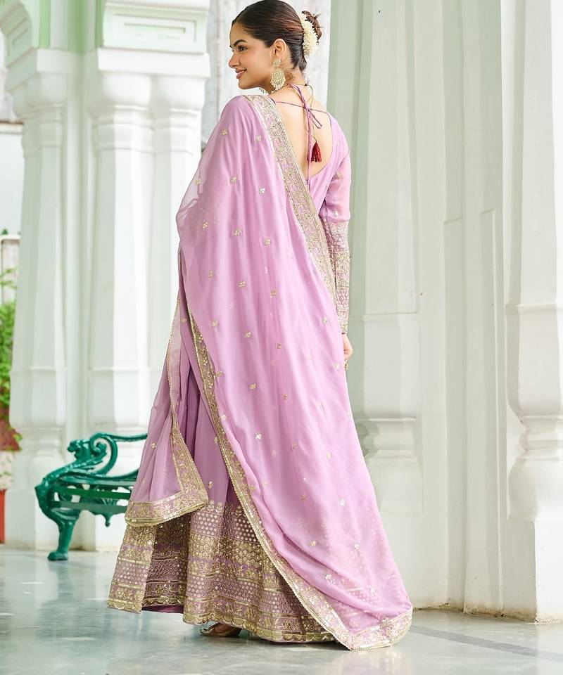 Faux georgette sequins embroidered designer party wear gown with matching dupatta | lavender | look stitched