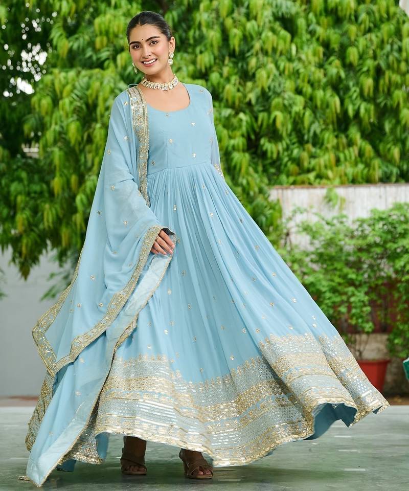 | Product Description | Step Into Elegance With This Stunning Sky Blue Faux Georgette Embroidered Gown, Crafted For A Luxurious And Graceful Silhouette. The Lightweight Georgette Fabric Offers An Effortless Fall While The Sequins Multi Embroidered Detailing Adds A Sparkling Festive Charm. Designed For Comfort And Style, This Stitched Gown Fits Beautifully Across Sizes And Pairs With A Perfectly Matching Embroidered Dupatta—An Ideal Choice For Weddings, Parties, Festive Functions, And Special Events. |