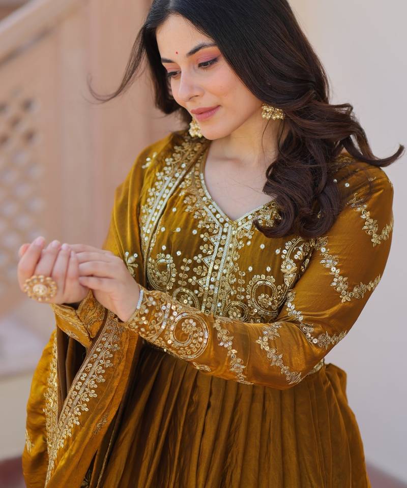| Product Name | Fendy Fabric Zari Embroidered Stitched Gown With Dupatta Mehendi | |