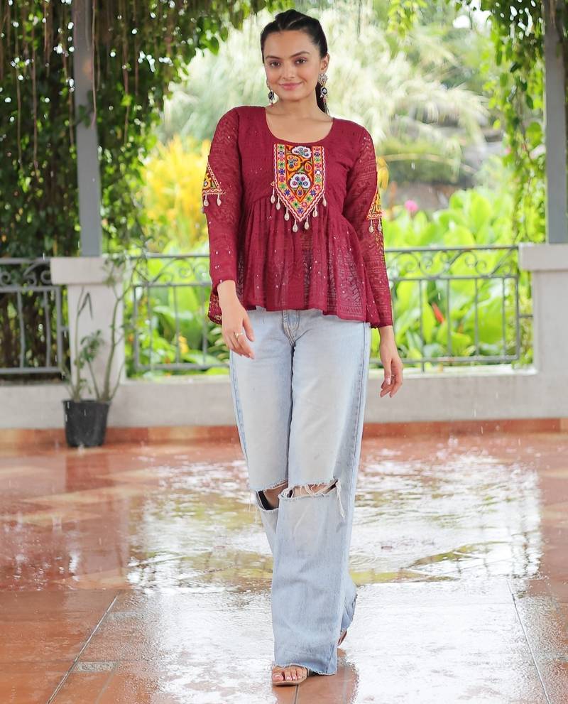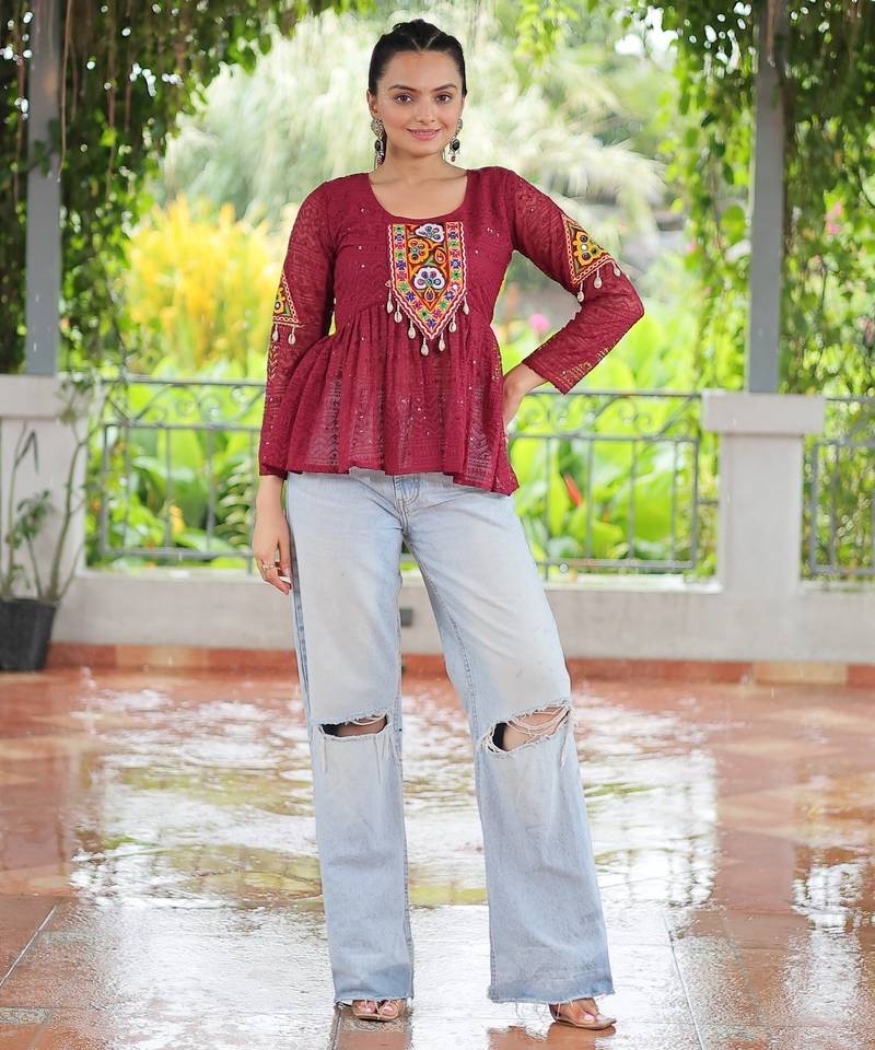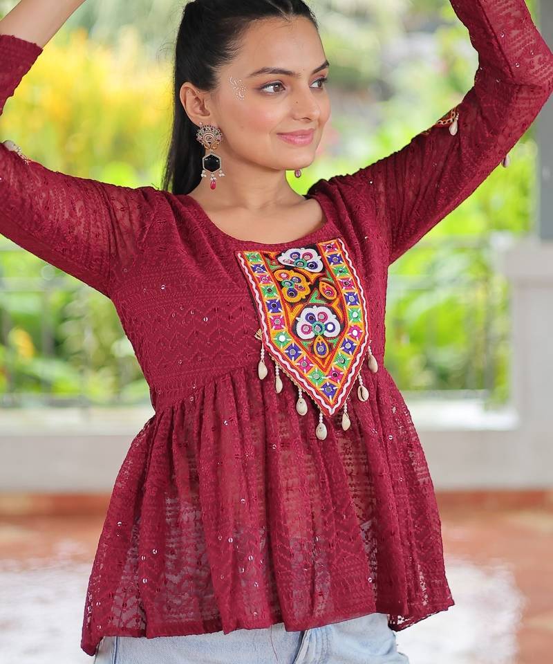 Georgette kutchi gamthi semi-stitched kurta with matching flared lehenga – maroon semi stitched