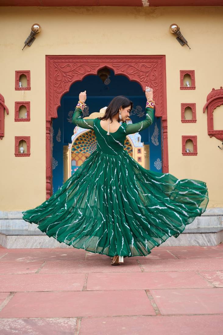 Green faux georgette kutchi patchwork gown for women | semi stitched traditional & festive wear gown
