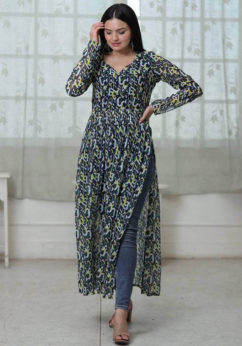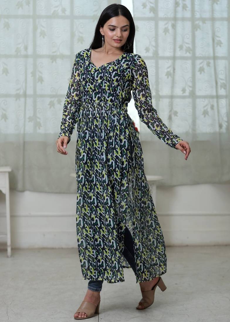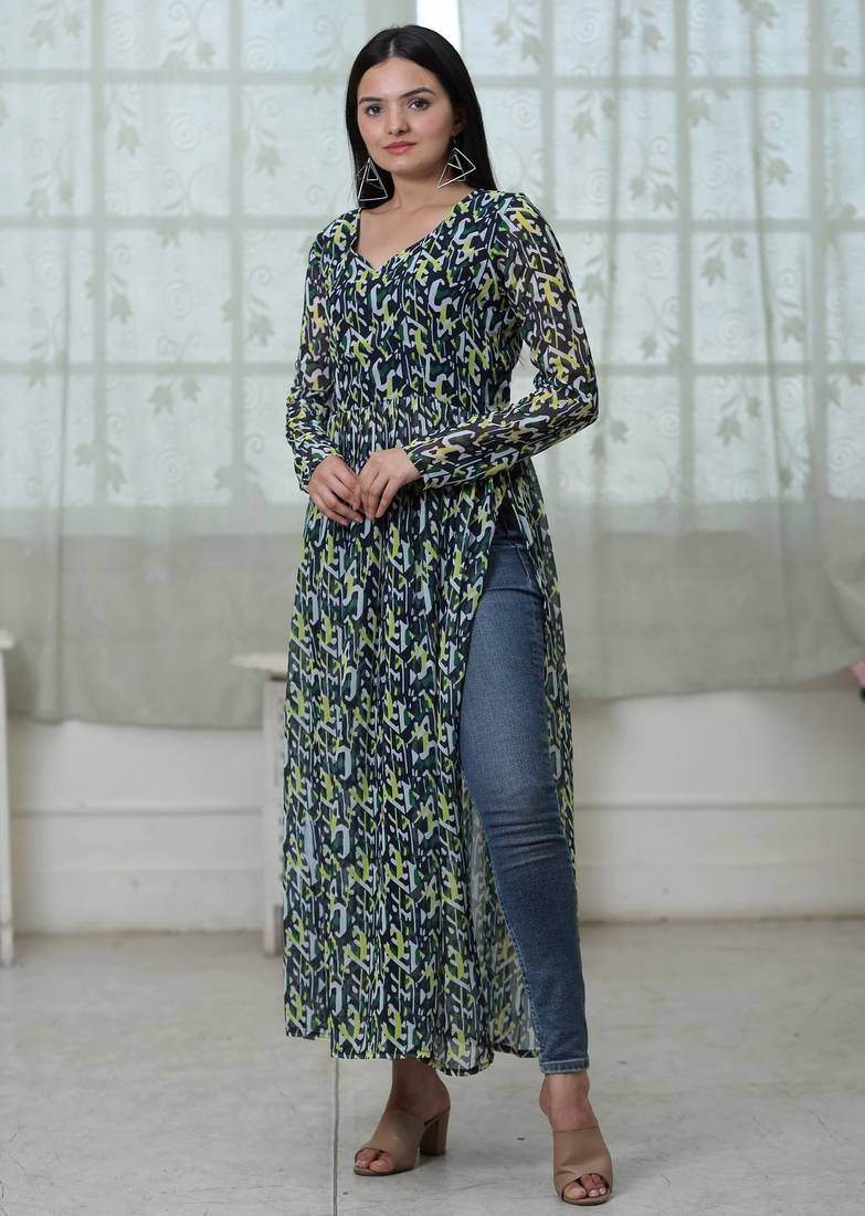 Green fox georgette printed kurta – soft, lightweight & perfect for daily wear stitched