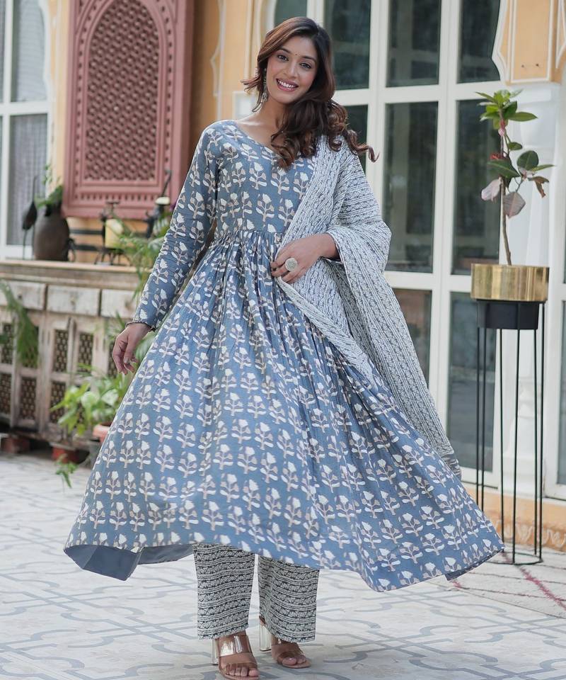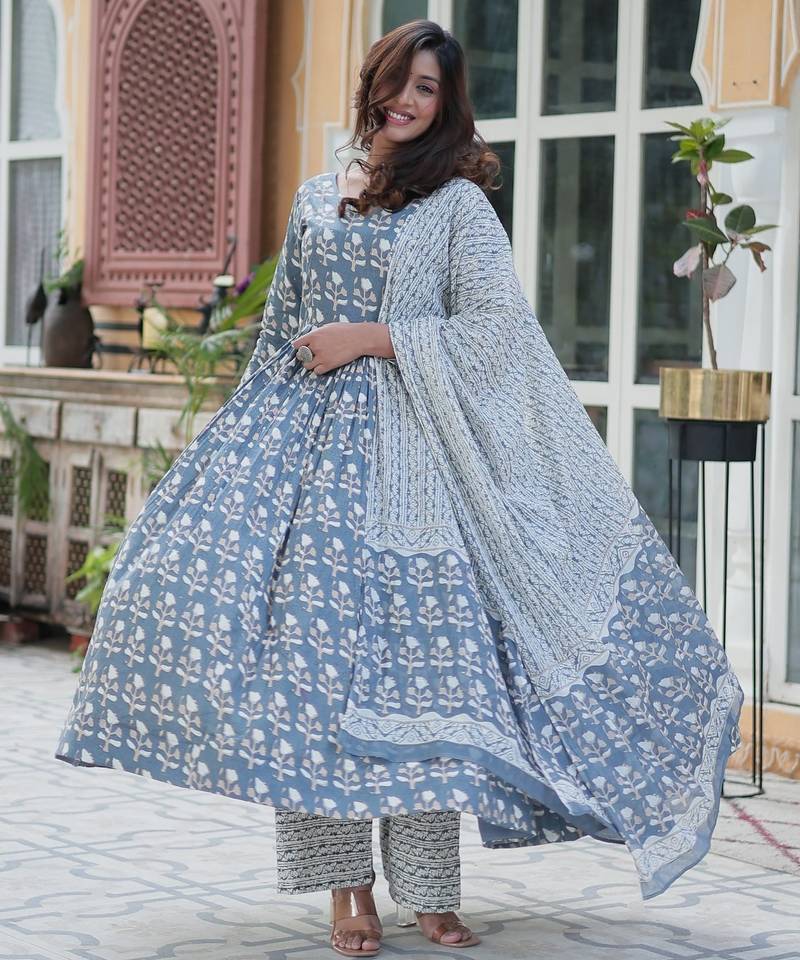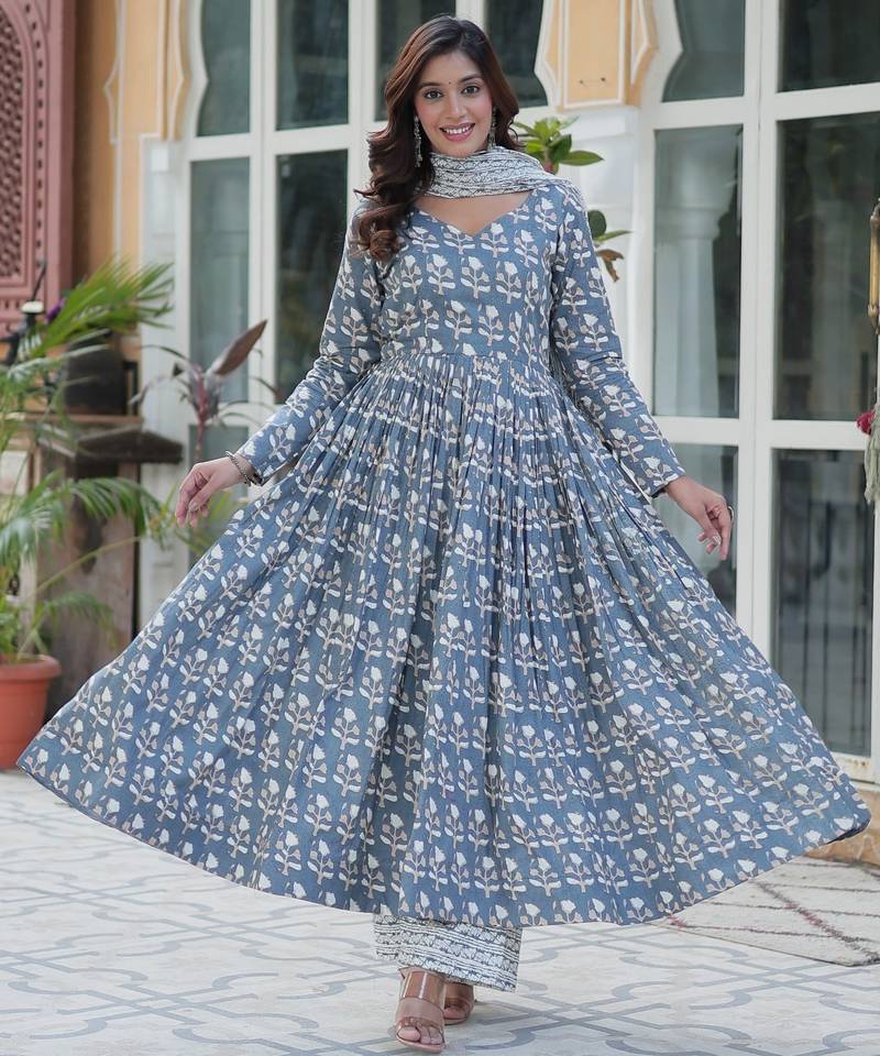 | Product Description | This Grey Pure Cotton Kurta Set Is Crafted For All Day Comfort With Its Breathable, Lightweight Fabric That Feels Soft On The Skin. The Coordinated Printed Kurta, Bottom, And Dupatta Create A Stylish And Balanced Ethnic Look Suitable For Office Wear, Casual Outings, Daily Use, And Festive Casuals. With A Long Kurta Silhouette And Fully Stitched Construction, This Set Offers Both Elegance And Ease Of Movement. |