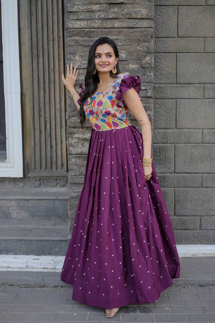 Maslin embroidered readymade gown wine | 56" length | festive & occasion wear stitched