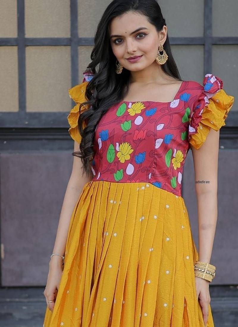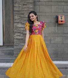 | Product Name | Maslin Chinon Embroidered Readymade Gown Mustard | 56" Length | Festive & Traditional Wear | |