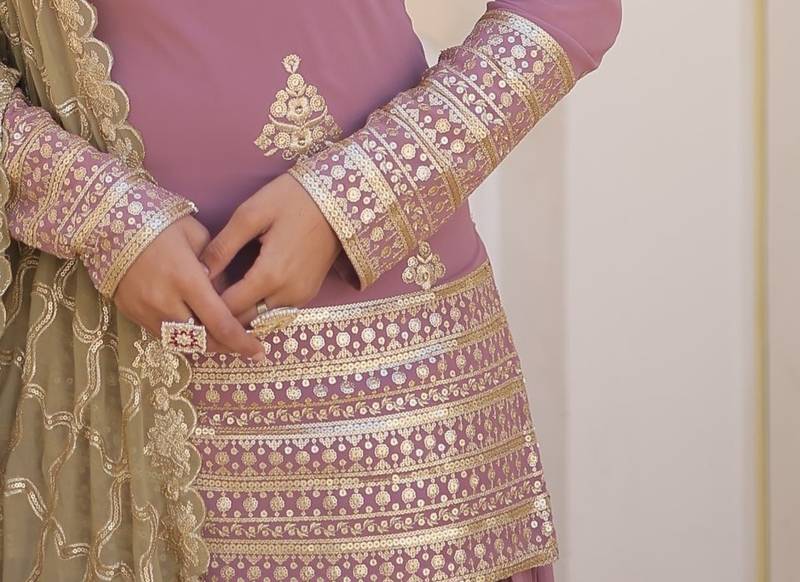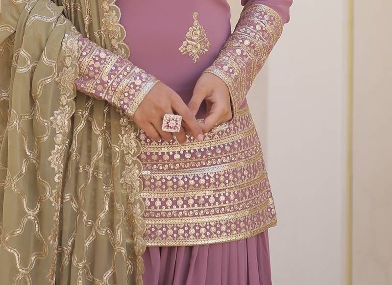 Onion pink faux georgette kurta set with thread embroidery & sequins dupatta – elegant occasion wear stitched