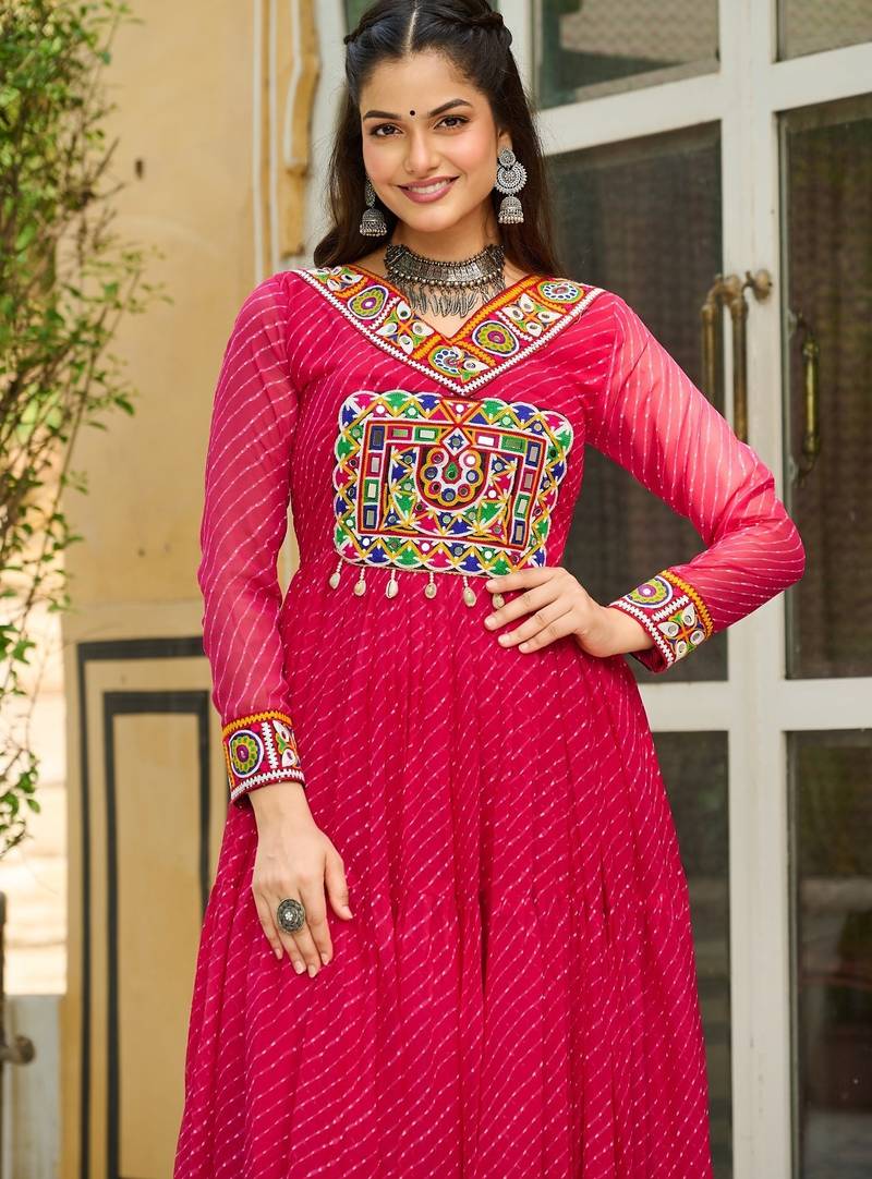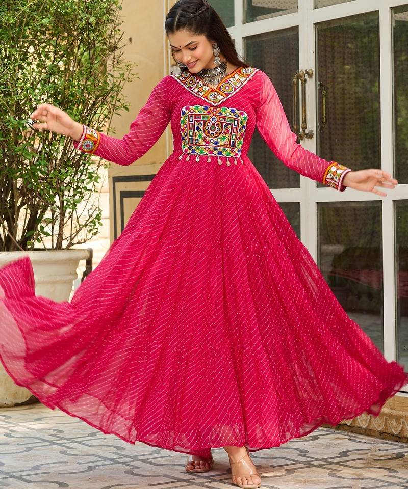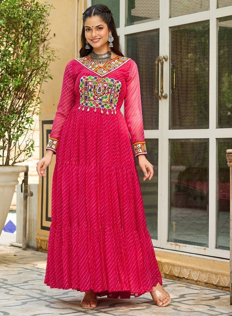 | Product Description | Add A Touch Of Traditional Elegance To Your Festive Wardrobe With This Beautiful Pink Faux Georgette Kutchi Gamthi Gown. The Colorful And Artistic Gamthi Print Reflects Rich Cultural Craftsmanship, Making It Perfect For Navratri, Festive Gatherings, Cultural Events, And Special Occasions. Crafted From Soft, Flowy Faux Georgette, This Gown Drapes Gracefully And Offers All Day Comfort. The Semi Stitched Design (Up To Size 42) Allows Easy Customization For A Perfect Fit. Its Refreshing Pink Tone Combined With Detailed Gamthi Artwork Makes This Gown A Stylish And Eye Catching Ethnic Choice For Modern Women. |