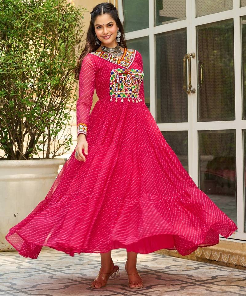 | Product Name | Pink Faux Georgette Kutchi Gamthi Printed Gown For Women | Semi Stitched Traditional & Festive Wear Gown | |