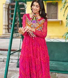 Pink faux georgette kutchi patchwork gown for women | semi stitched traditional & festive wear gown