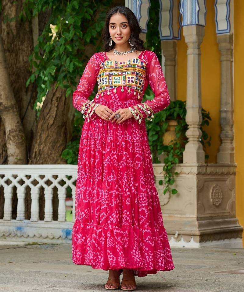 | Product Description | Elevate Your Festive Style With This Stunning Pink Faux Georgette Kutchi Patchwork Gown, Designed To Blend Traditional Charm With Modern Elegance. The Bright Pink Tone Paired With Detailed Kutchi Patchwork Creates A Rich Ethnic Look Ideal For Navratri, Garba, Festive Gatherings, Temple Visits, Cultural Events, And Daytime Celebrations. Made From Lightweight Faux Georgette, It Offers Soft Movement And Lasting Comfort. The Semi Stitched Pattern, Fitting Up To Size 42, Allows You To Customize The Fit Perfectly. This Gown Is A Beautiful Fusion Of Culture And Contemporary Fashion—Perfect For Women Who Love Vibrant And Graceful Ethnic Outfits. |