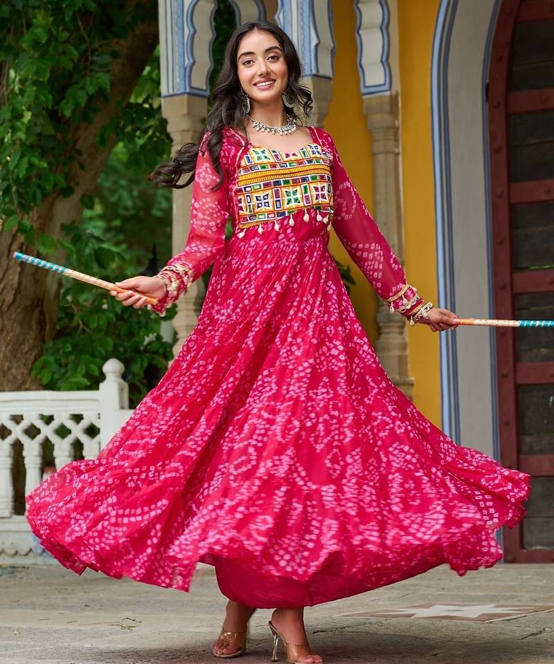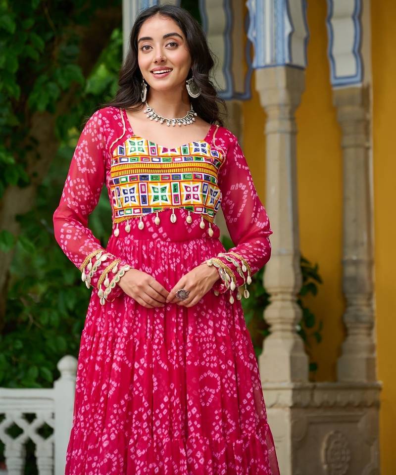 Pink faux georgette kutchi patchwork semi stitched gown for women | vibrant festival wear gown