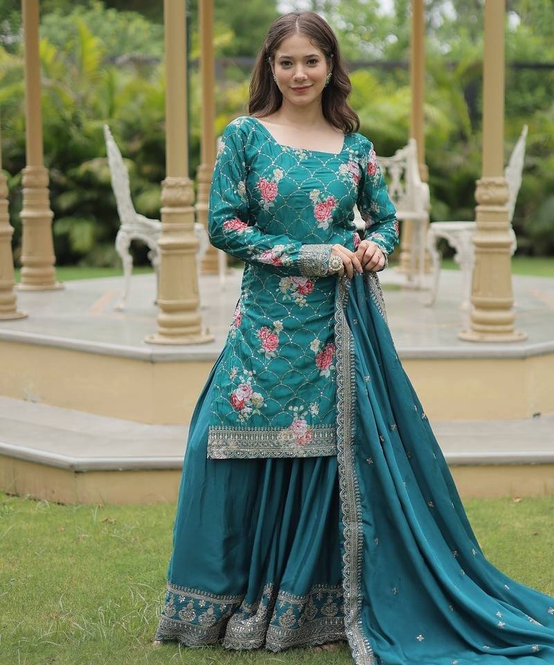 The Outfit Includes A Beautifully Coordinated Chinnon Bottom And A 2.25 Meter Sequins Embroidered Dupatta, Completing The Traditional Ensemble. With Fully Stitched Tailoring And Availability In Multiple Sizes, It Provides A Flattering And Easy To Wear Fit For All Day Comfort.