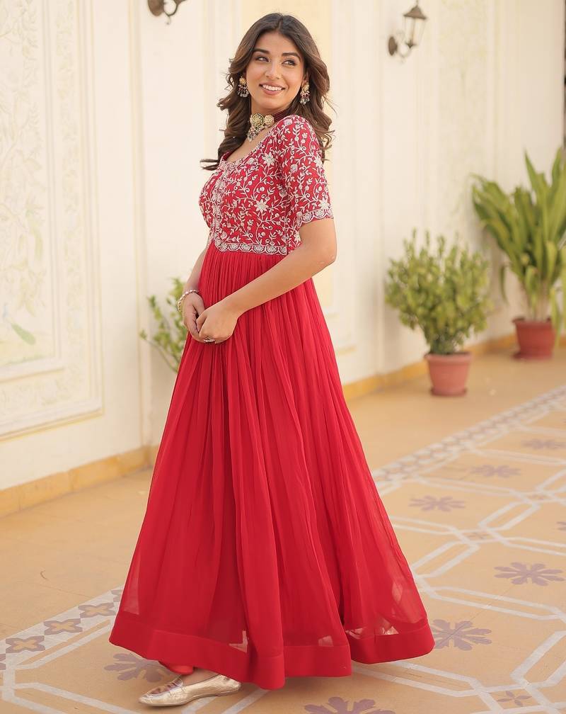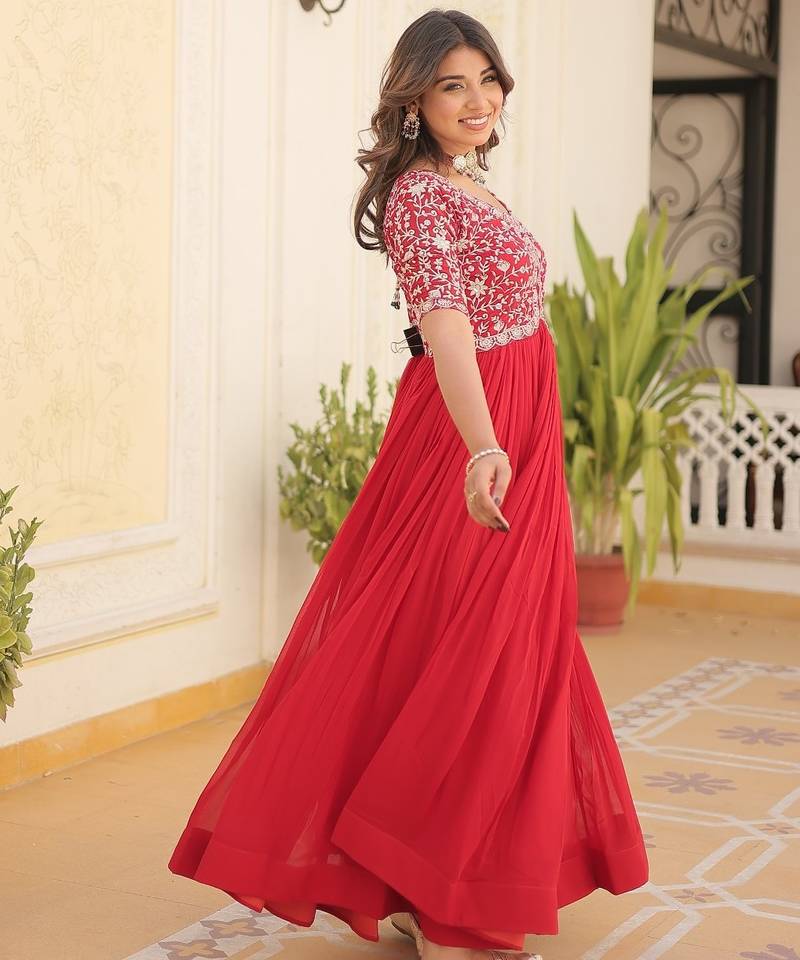 | Product Description | A Stunning Red Designer Gown Crafted From Rich Faux Blooming Fabric, Beautifully Highlighted With Intricate Sequin & Thread Embroidery. This Elegant Outfit Delivers A Premium Festive Appeal—Perfect For Weddings, Receptions, Sangeet, Parties, And Celebration Events Where You Want To Stand Out Gracefully. |