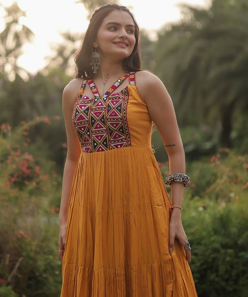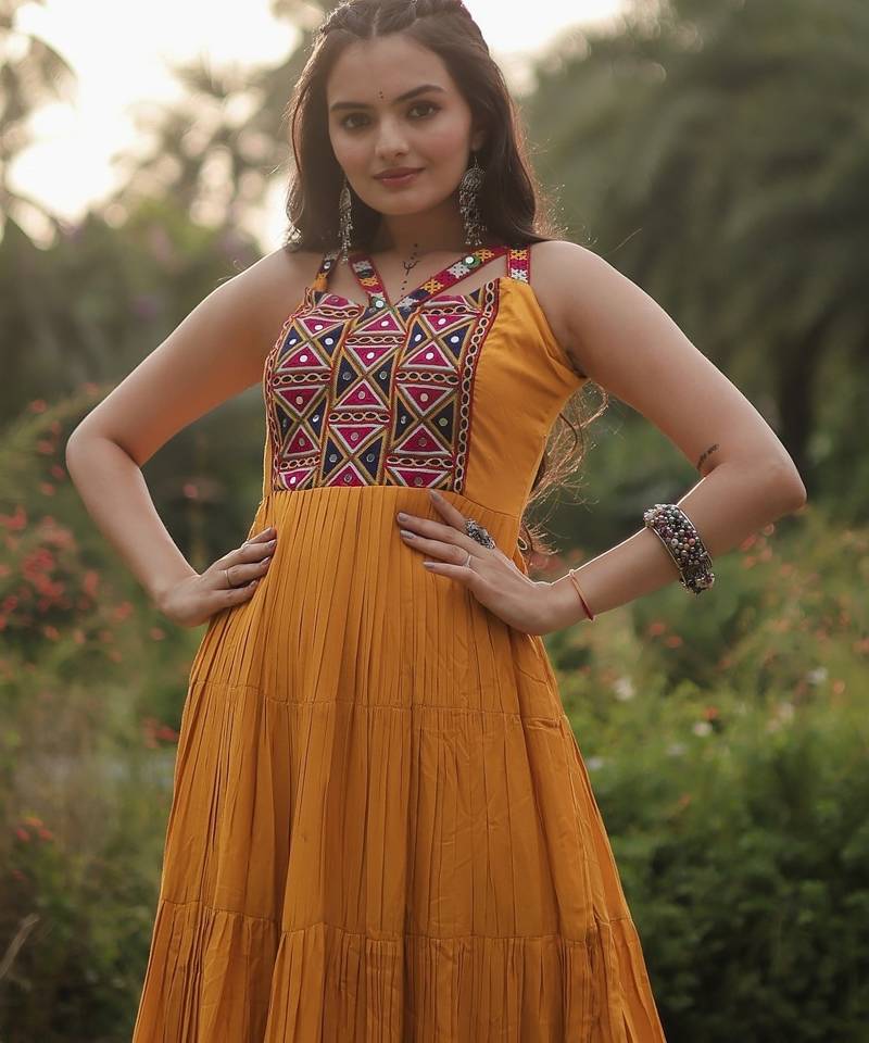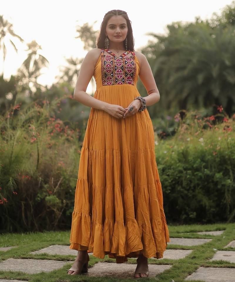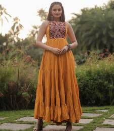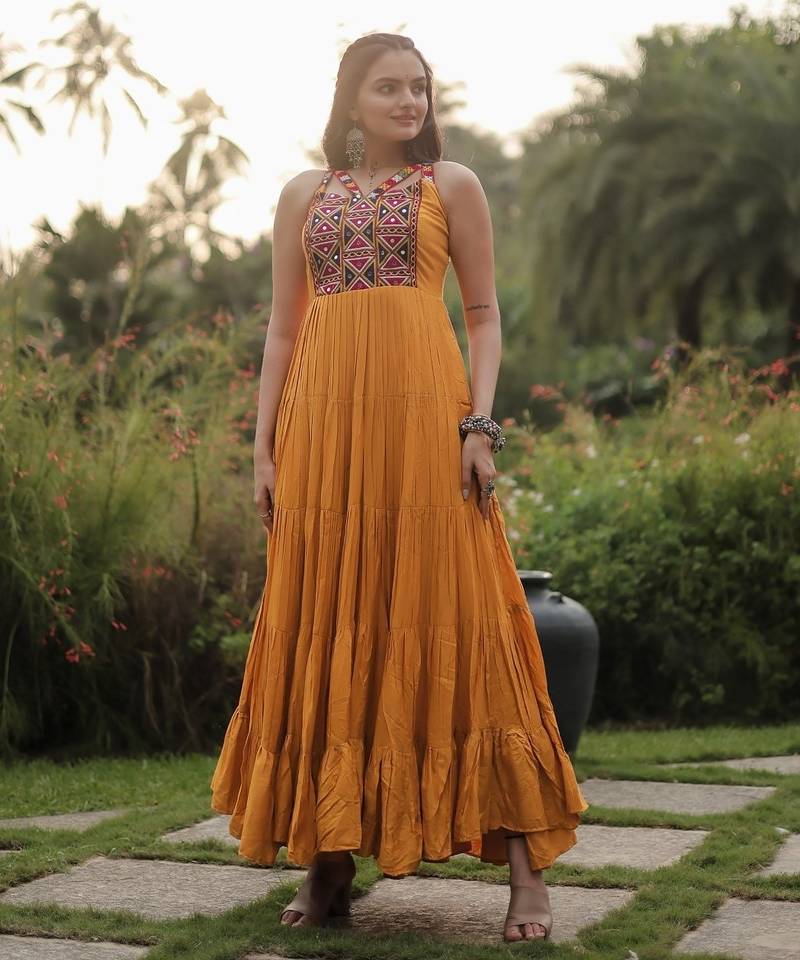 Reyon embroidered semi-stitched gown yellow | up to 42 size | 54" length | lightweight ethnic wear