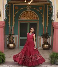 Product Name Reyon Fabric Printed Stitched Gown With Dupatta Maroon | Up To 42 Size | 56" Length