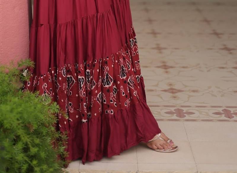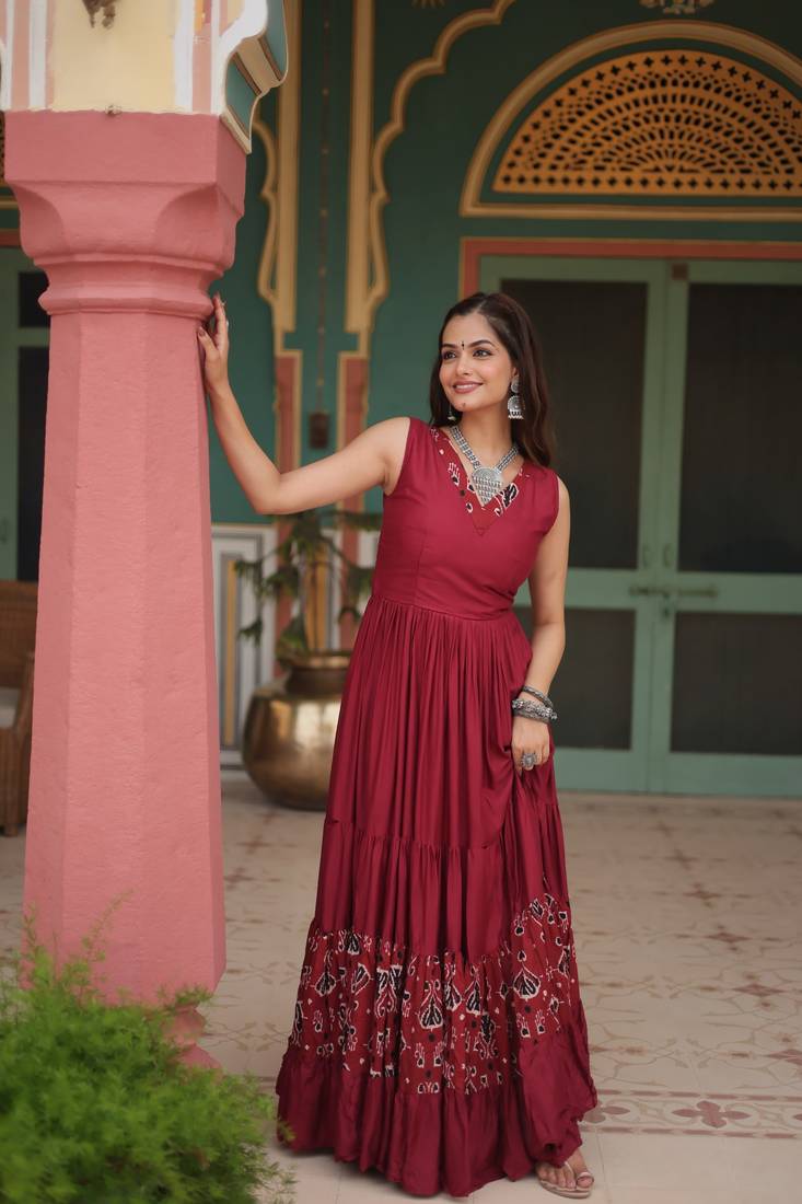 Rich, Stylish, And Effortlessly Graceful—This Maroon Printed Gown Is Crafted Using Premium Reyon Fabric, Offering A Soft Texture And Comfortable Drape Perfect For All Day Wear. The Elegant Printed Pattern Enhances Its Ethnic Charm While Keeping The Look Lightweight And Modern.