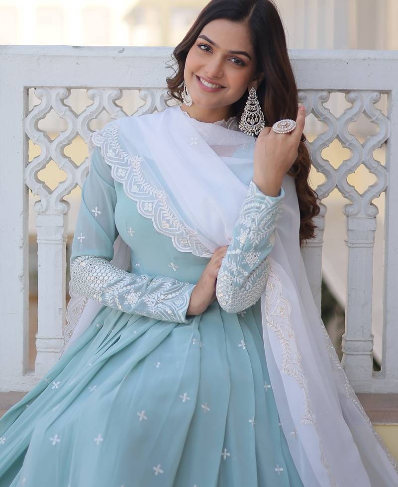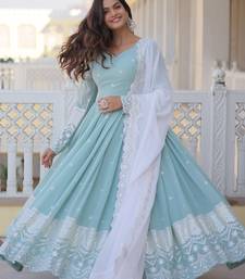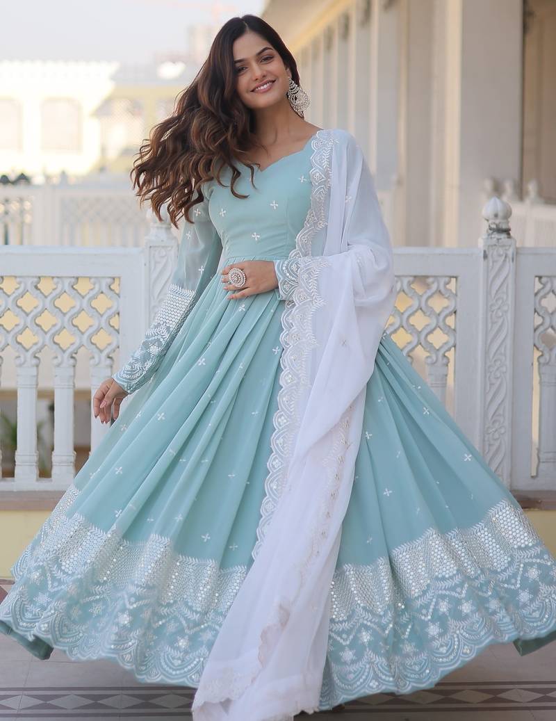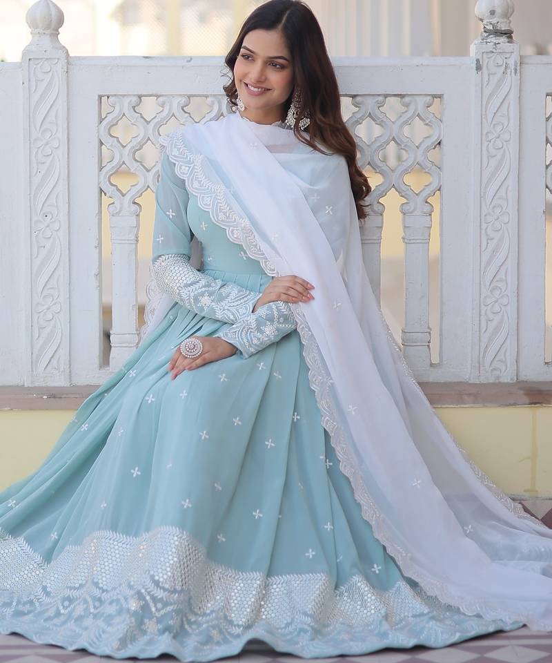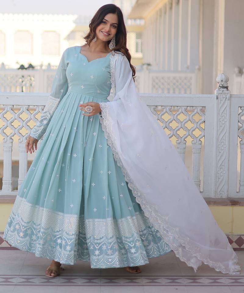 | Product Description | Step Into Elegance With This Sky Blue Fox Georgette Gown, Paired With A Luxurious Russian Silk Dupatta. The Rich Sequin And Embroidery Work Adds A Sparkling Festive Charm, Making It The Perfect Choice For Weddings, Receptions, And Celebrations. |