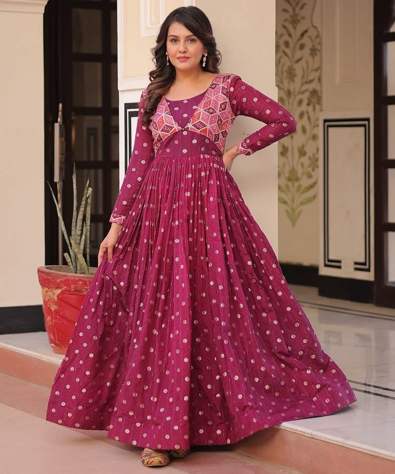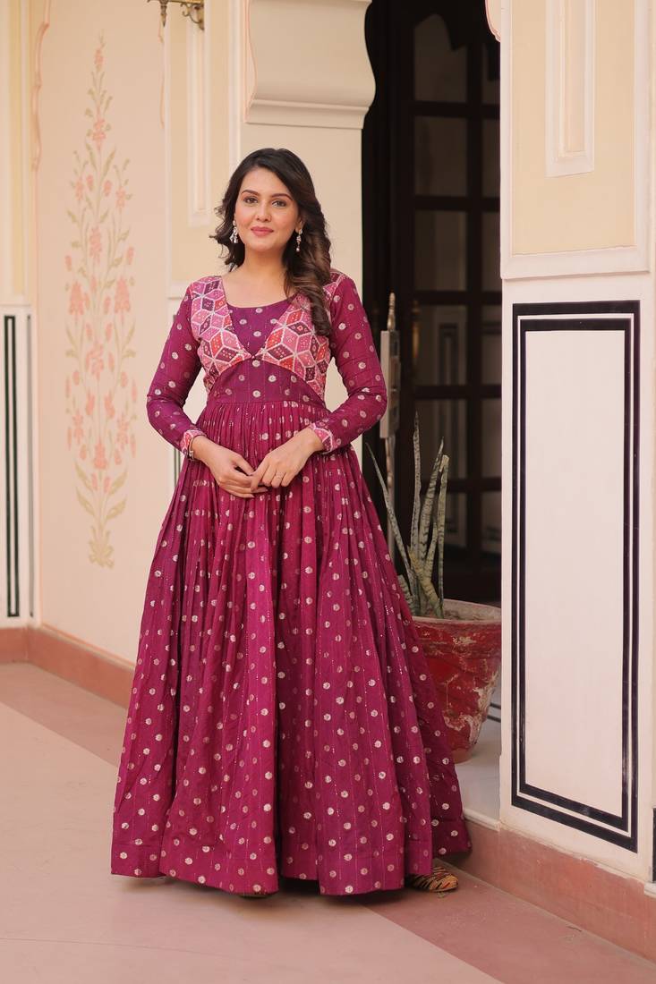 Its Deep Wine Shade Adds A Touch Of Royal Charm, Making It Perfect For Festive Functions, Parties, And Cultural Celebrations. Fully Stitched For Effortless Wear, This Gown Offers A Comfortable Yet Flattering Drape Suitable For Women Of All Ages.