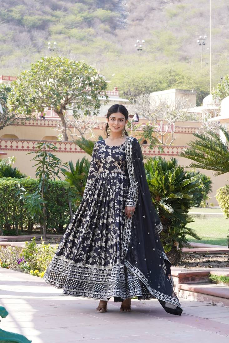 With A Full 56 Inch Stitched Design And 2.3 Meter Flair, This Gown Brings A Regal Silhouette Ideal For Celebrations, Events, And High End Gatherings.